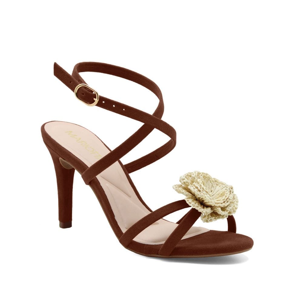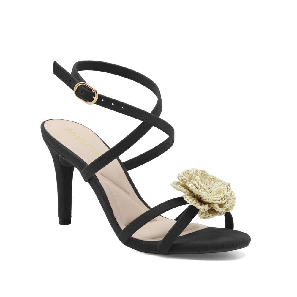 Sandalia con flor de rafia, tiras finas.