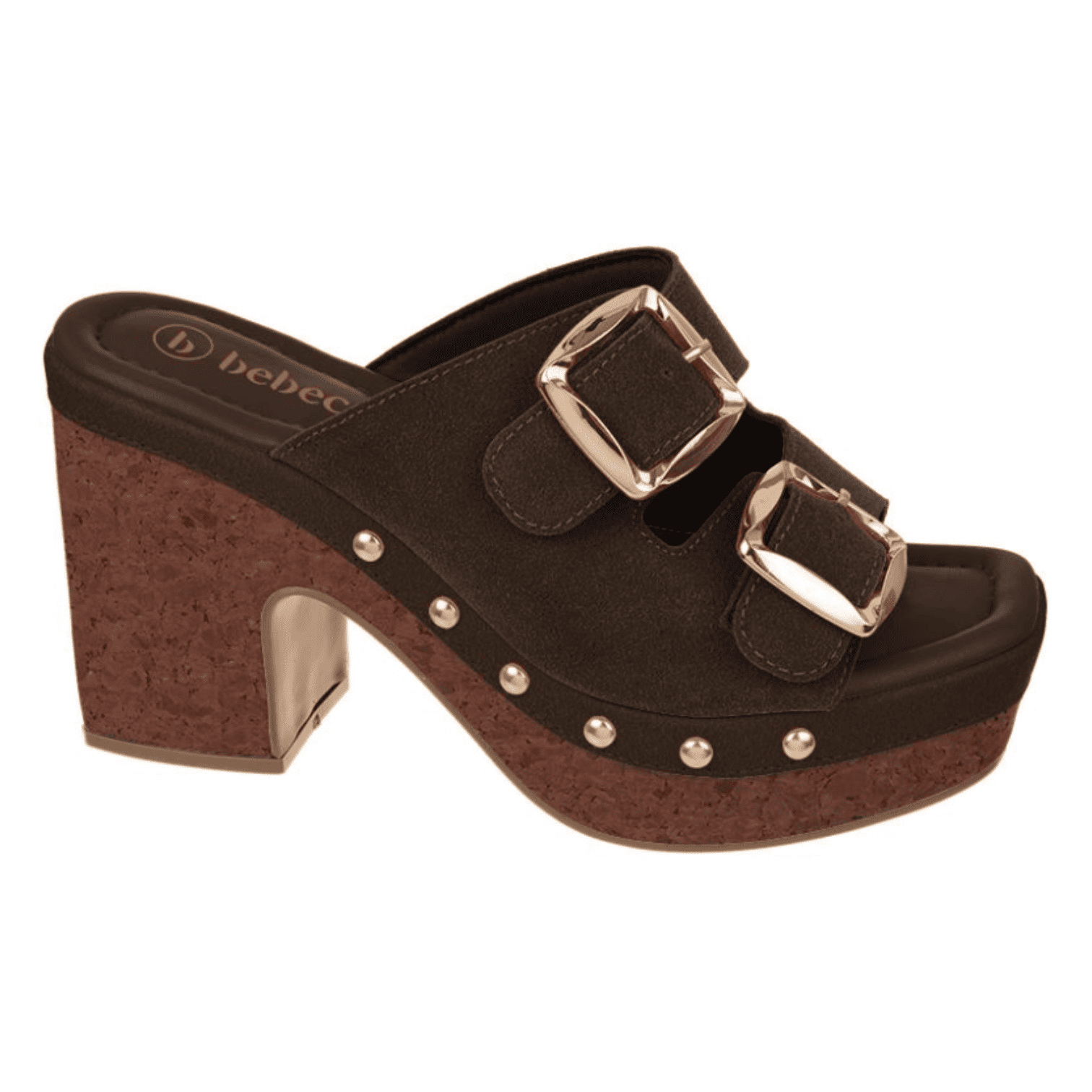 Sueco tipo sandalia en gamuza con hebillas y tachuelas doradas.
